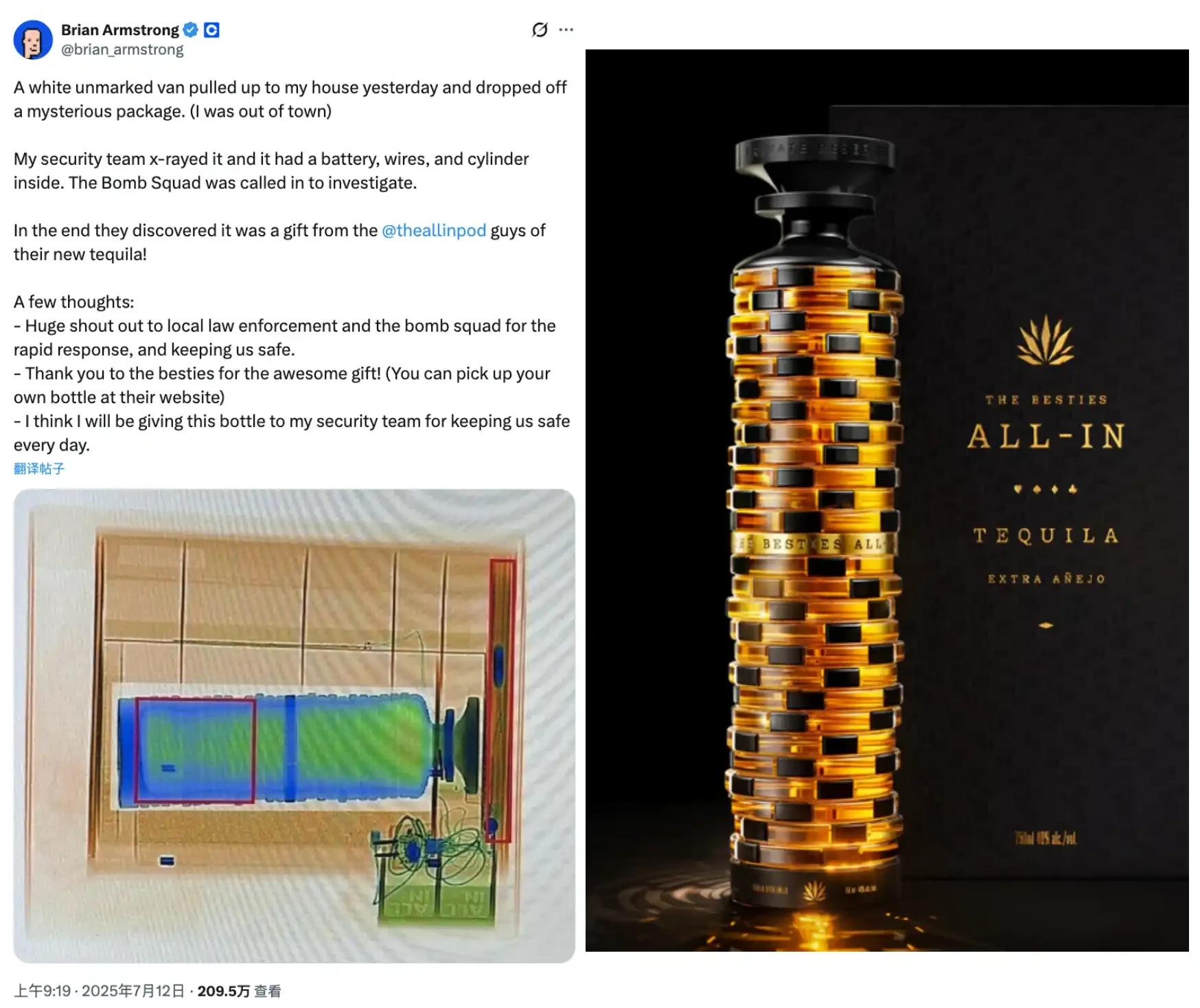 经过仔细检查后真相大白:包裹内装的是 The All-In Podcast(@theallinpod)播客节目组赠送的龙舌兰酒礼盒,X 光片上显示的电池和电线实际上是为酒瓶发光装置的设计。