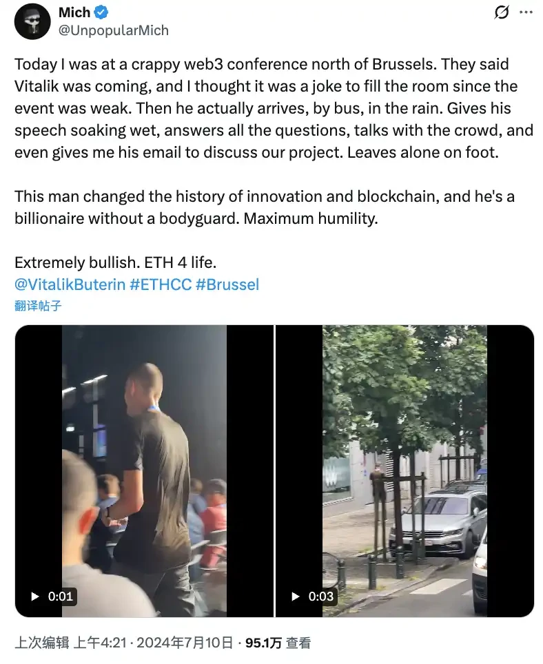 但似乎在大多数时候,人们都看不到 Vitalik 带保镖,比如 2024 年 7 月在布鲁塞尔举行的 ETHCC 会议上,Vitalik 在雨中独自乘坐公交车抵达,演讲时衣服还是湿的,结束后也是徒步离开,全程没有任何保镖陪同。