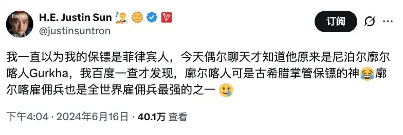 后来孙哥还在社交平台上说误以为这名保镖是菲律宾人,结果竟然是尼泊尔廓尔喀人,全球最有名的雇佣兵体系之一。