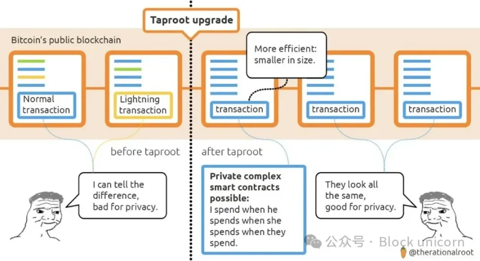 比特币担保的汇总(Rollup)信任最小化的跨链桥可编程的比特币金库链下计算、链上验证2. 像 Taproot 这样的升级悄然扩展了比特币的应用范围:Taproot 最初并非作为 DeFi 升级来推广的,但它却为 BTCFi 提供了所需的加密基础:更低成本的多重签名、更灵活的密钥路径支出以及更佳的隐私保护。更重要的是,它使得 Taproot Assets(用于稳定币)以及更高级的金库系统等架构成为可能。
