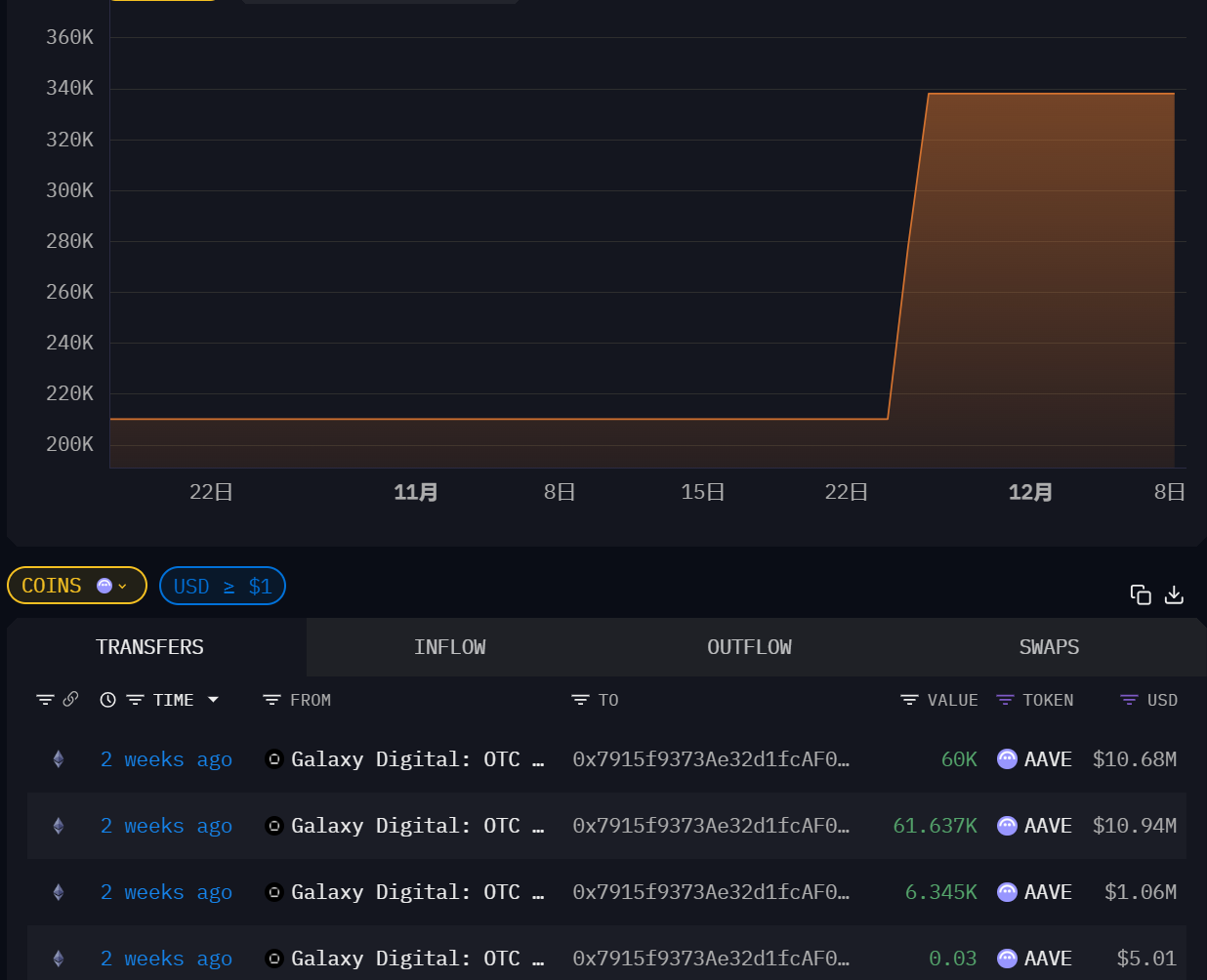 几乎在同一时间窗口内,知名加密投资机构 Multicoin Capital 亦开始持续布局 AAVE:自 10 月 17 日起,通过 Galaxy Digital OTC 渠道逐步增持,目前持仓约 33.8 万枚 AAVE,市值约 6530 万美元。