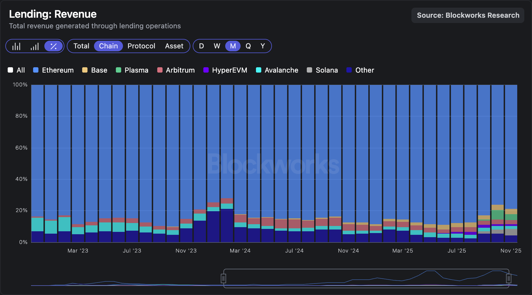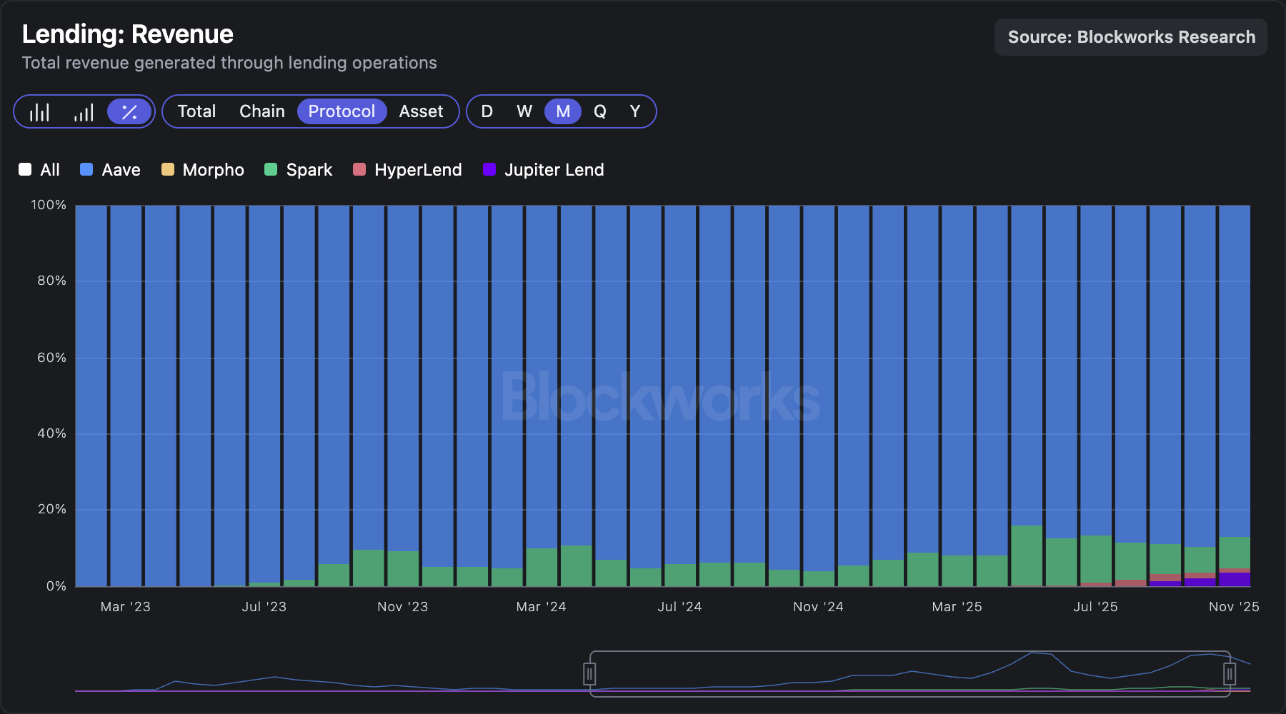 尤其是在收入维度上。作为衡量 DeFi 协议价值最核心的指标,Aave 在借贷市场占据绝对主导地位。借贷市场约 79% 的收入来自以太坊主网,而其中 87% 归属于 Aave 本身。