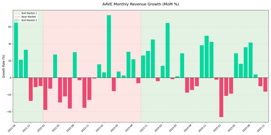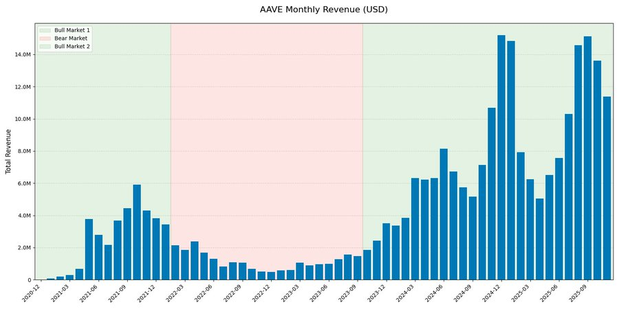 在当前周期(“第二轮牛市”)中,Aave 的月度收入出现爆发式增长,峰值接近 1500 万美元,是 2021 年高点的两倍以上。尽管增长幅度显著,但环比收入图表清晰显示:收入仍然高度波动,主要由市场活跃度驱动,而非呈现出线性稳步扩张的特征。