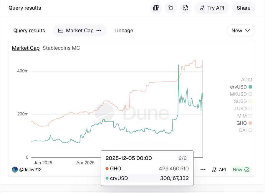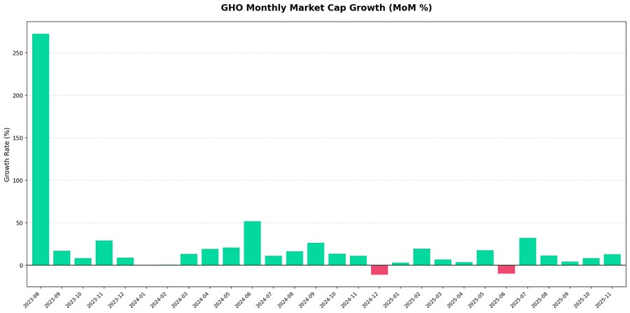 自 2023 年第三季度上线以来,GHO 维持了稳健的上升通道,截至 2025 年底,其市值已突破 4 亿美元。