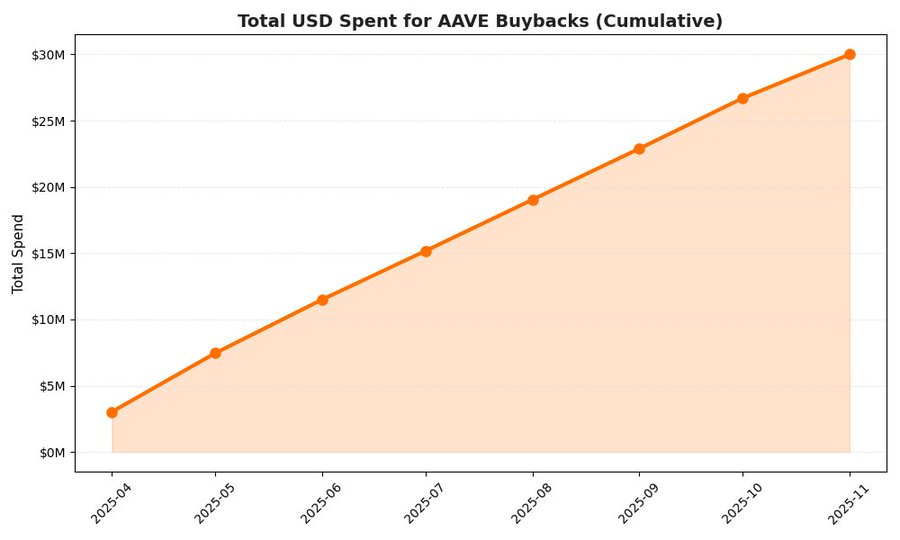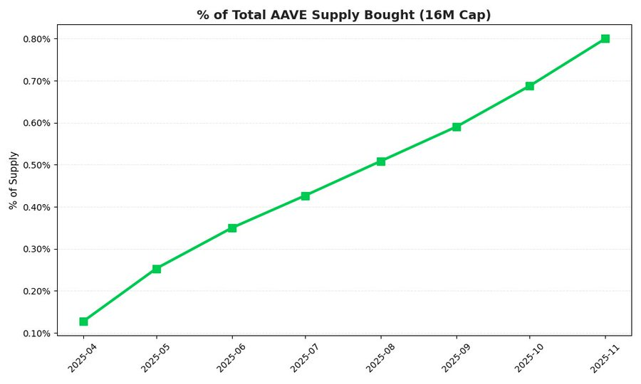 回购机制已经对代币供给产生了可量化的通缩压力:仅用 8 个月时间,协议已回购了约 0.80% 的总供应量(1600 万枚 AAVE)。