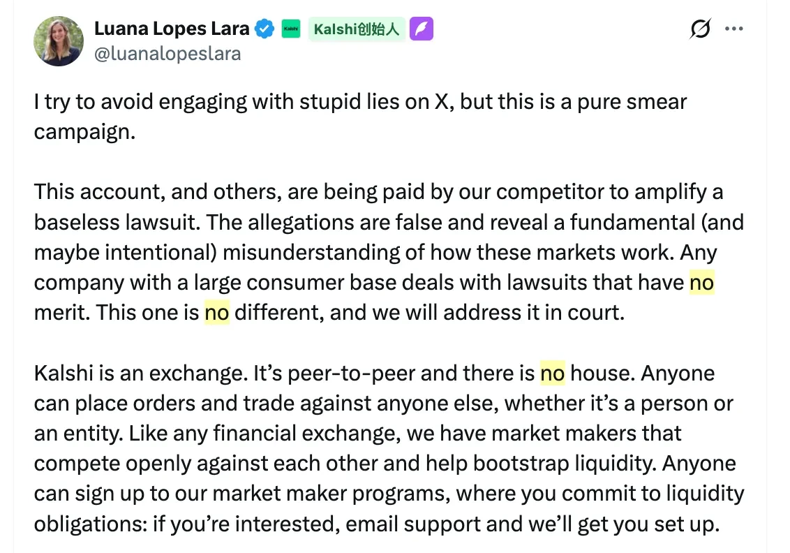 此外,Kalshi、Polymarket 已经或正在组建的内部做市团队也是丰富预测市场押注事件流动性的一环,正如 Kalshi 联创 Luana Lopes Lara 所说的那样,“Kalshi is an exchange.It's peer-to-peer and there is no house.”