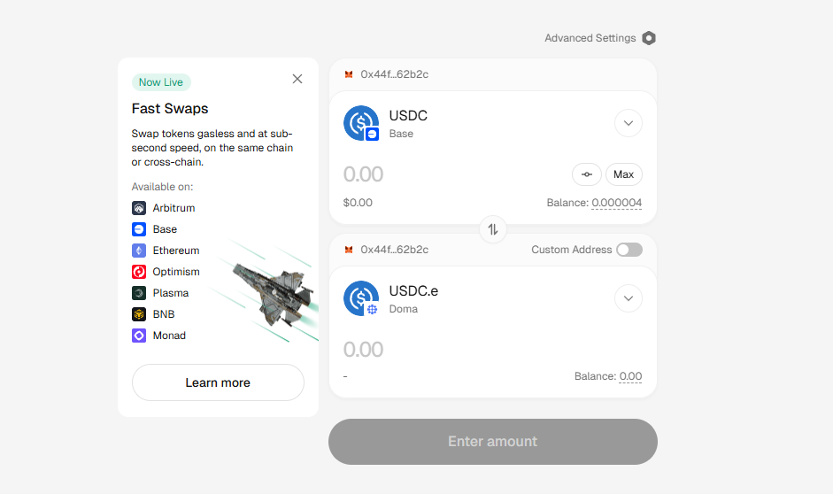 STEP 2. 通过跨链桥(链接:https://stargate.finance/?srcChain=base&srcToken=0x833589fCD6eDb6E08f4c7C32D4f71b54bdA02913&dstChain=doma&dstToken=0x31EEf89D5215C305304a2fA5376a1f1b6C5dc477),将其他 L2 的 ETH 跨至 Doma Protocol 主网。