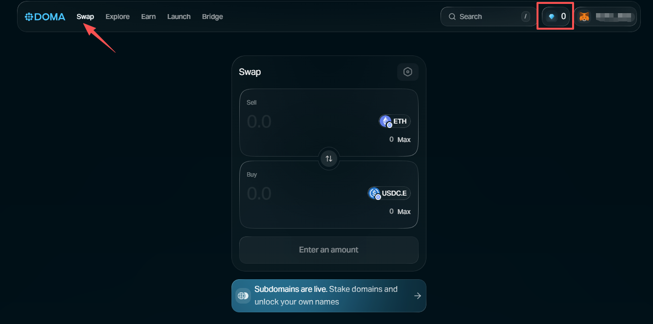 STEP 3. 回到交互网站,进行 Swap 操作赚取积分。此外,也可通过提供流动性、质押域名代币等方式赚取积分。