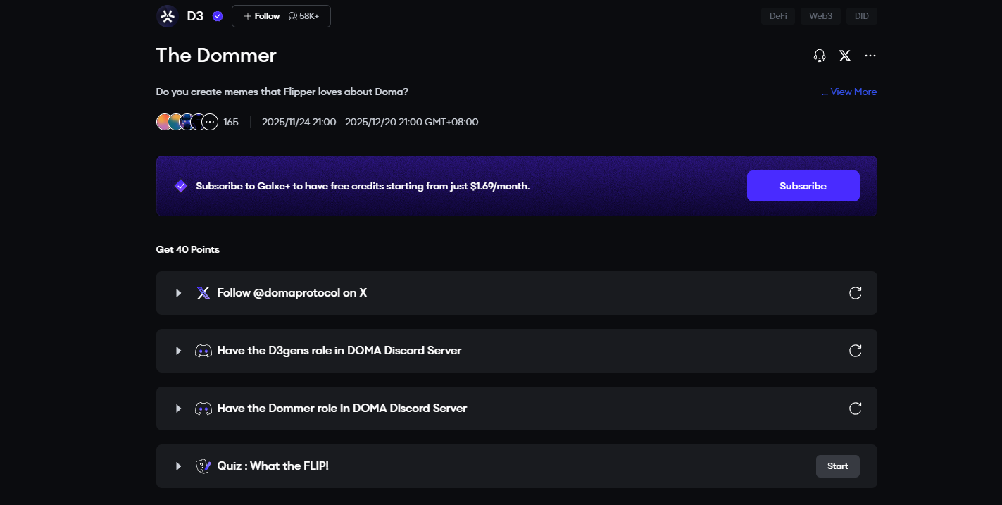 11 月 25 日,Doma Protocol 在 X 平台发文宣布主网已上线,并同步上线积分等级系统。