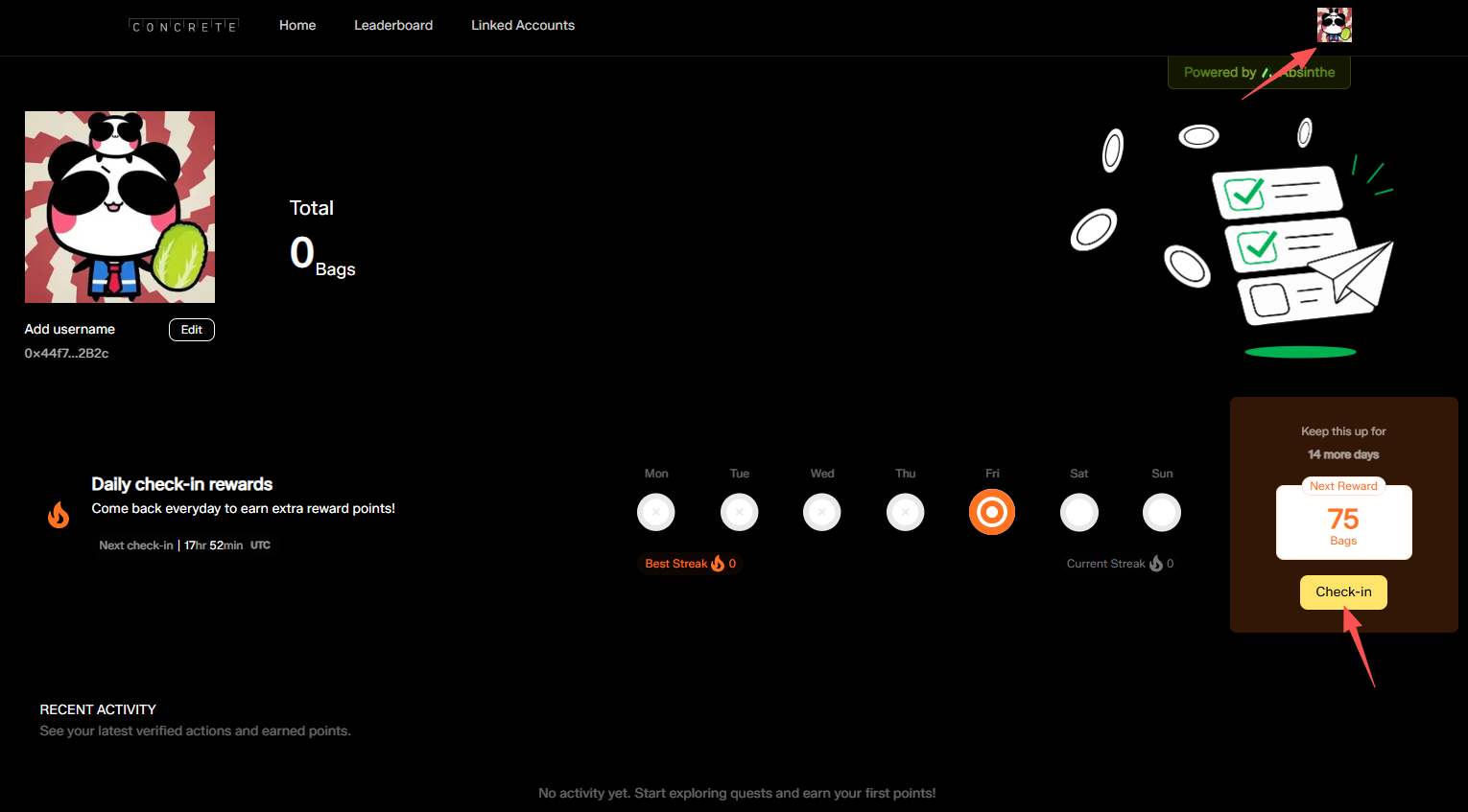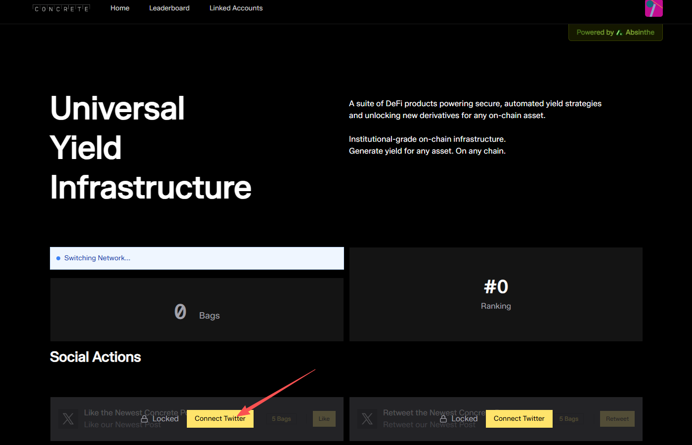 STEP 1. 进入交互网站(链接:https://points.concrete.xyz/home),点击“Connect”后连接钱包,并绑定 X 账号。